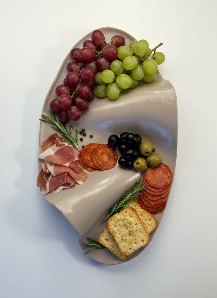 Den neutrala färgen gör den enkel att kombinera med andra serveringsfat och detaljer. Dess vågiga form gör den perfekt för ost, chark, snacks eller små tilltugg.